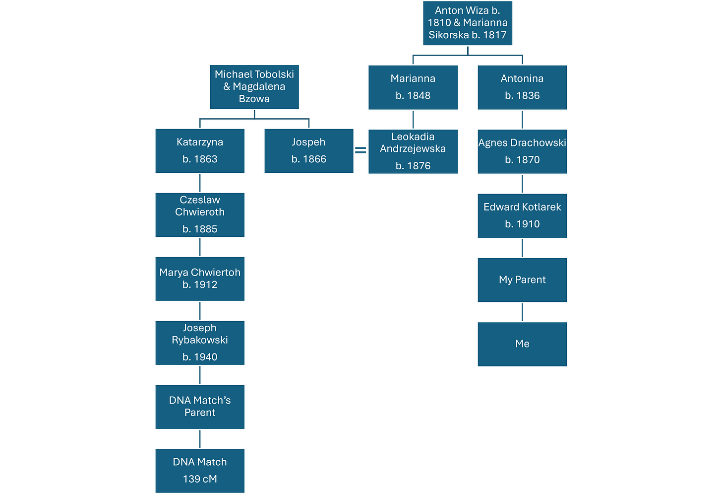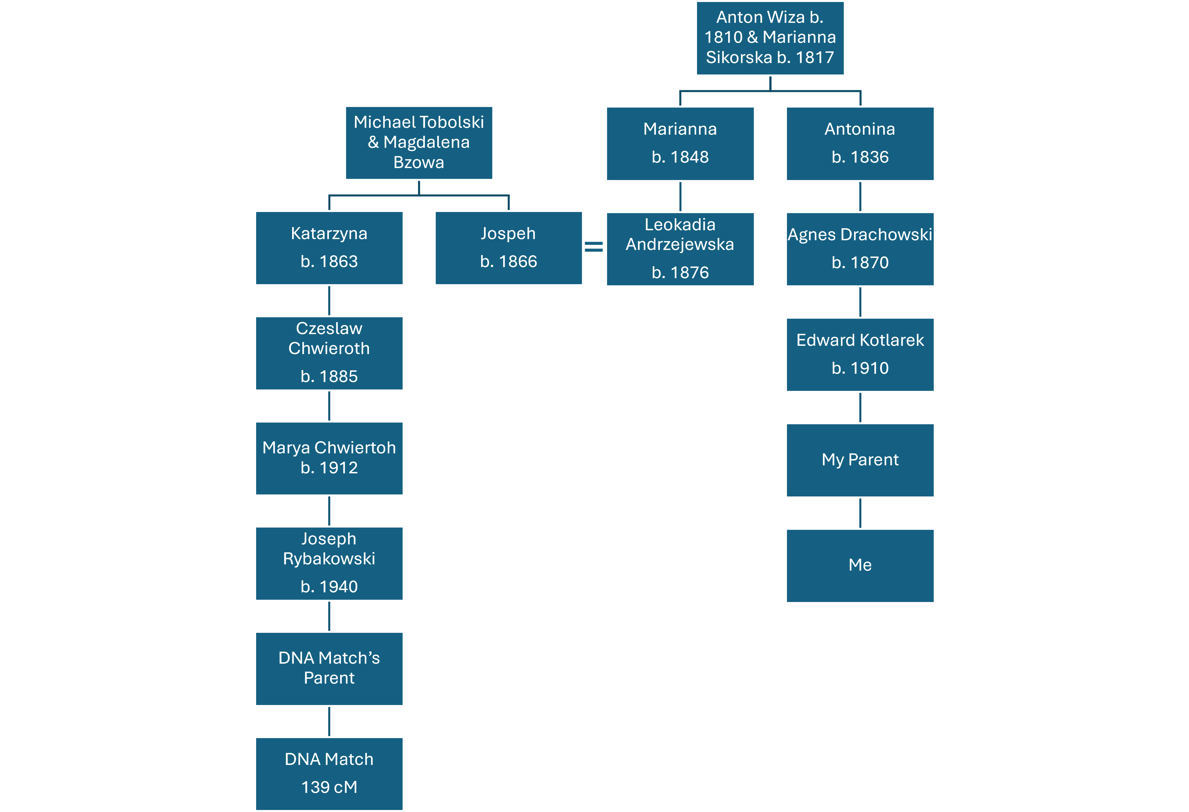 Hey Everyone. I need help. I have puzzled over this for hours, and this is where I am at. I have a DNA match at 139 cM. I have worked their tree back to a common surname. Here is the catch. Their ancestor is the sister of my relative’s husband. The attached chart shows the paper trail … many sources used: Ancestry dot Com, Geneteka, BaSIA Famula, Poznan Project, and FamilySearch. WHAT AM I MISSING HERE? How are the DNA Match and I related? We would need to have an MRCA on the Tobolski-Bzowa line, right?